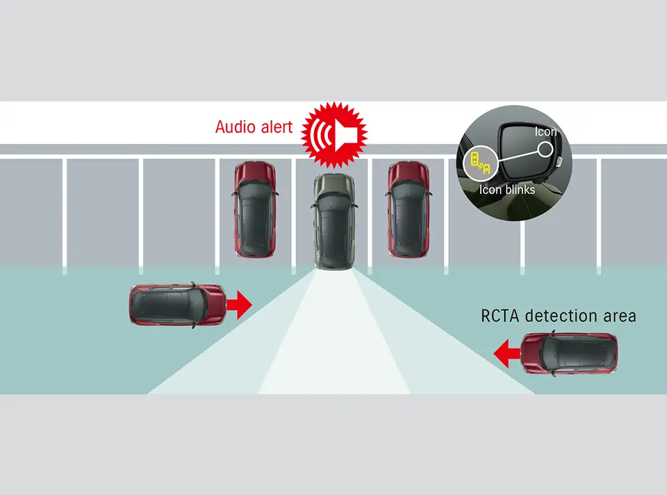 RCTA is a supplementary safety feature that uses blind spot monitor to detect and warn of vehicles approaching from the left or right when backing out of a parking space or other location.